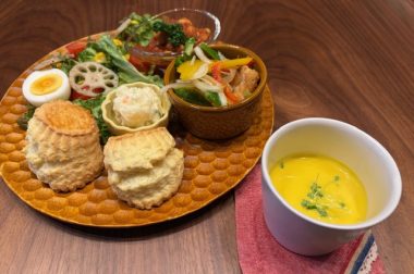 風味豊かな十勝産小麦を使い、気まぐれにオリジナルのパンやスコーンを焼いています。ボタンセットにサラダを付けることも可能。数量限定です。